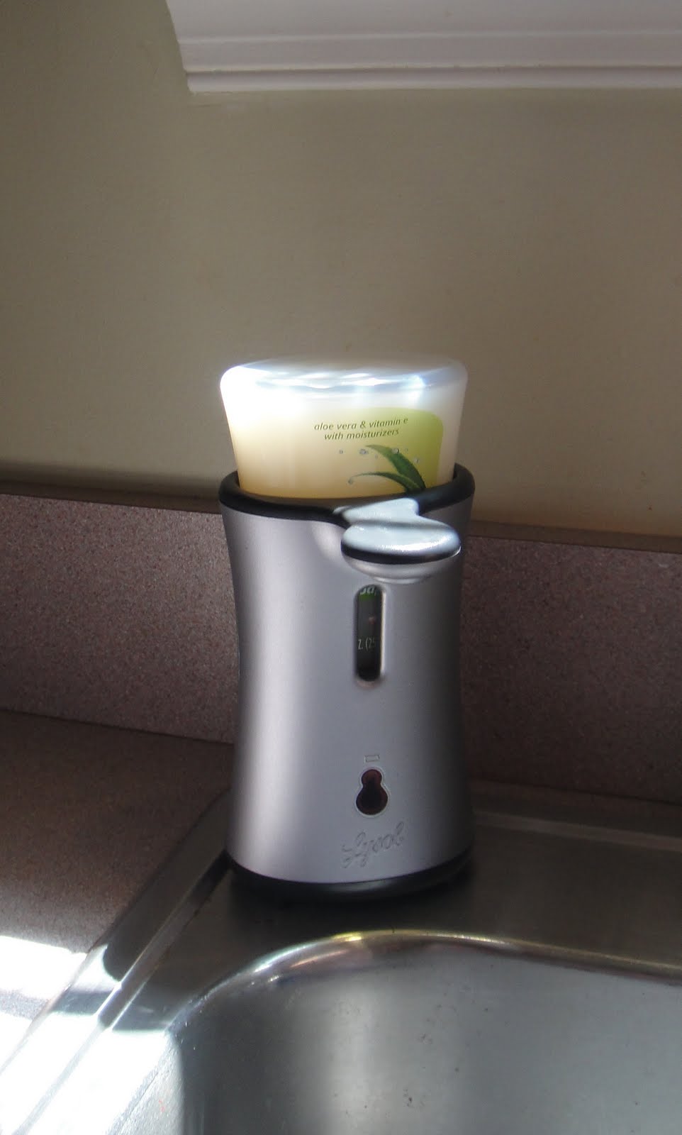 The kit includes the soap dispenser, a bottle of hand soap designed to fit into the dispenser, and four AA batteries. My kit included the Aloe Vera & Vitamin E with Moisturizers soap, but you can also choose from Refreshing Grapefruit Essence, Soothing Cucumber Splash, and Antibacterial Total Care.